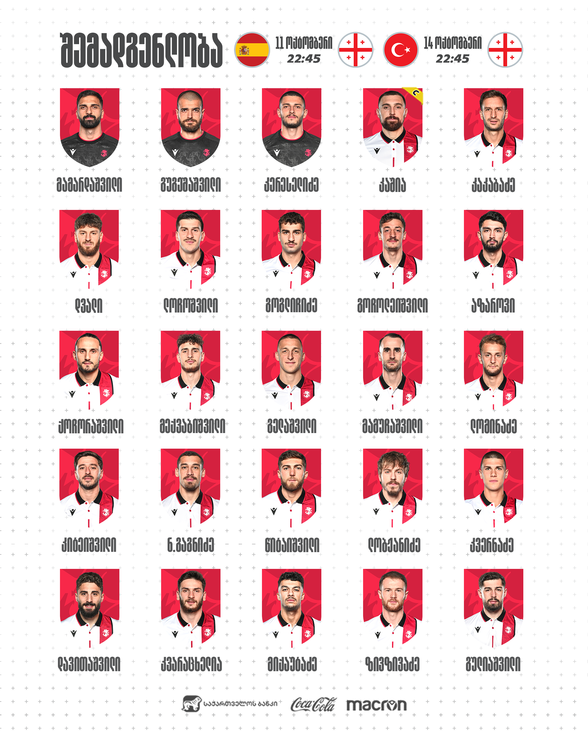 ცნობილია საქართველოს ნაკრების შემადგენლობა ოქტომბრის მატჩებისთვის
