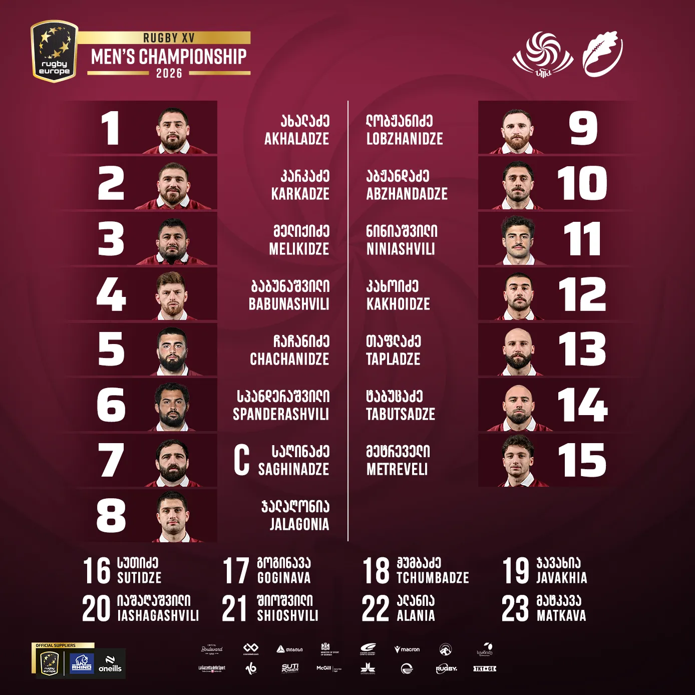 ბორჯღალოსნების სამწვრთნელო შტაბმა 2026 წლის რაგბი ევროპის ჩემპიონატის ნახევარფინალური შეხვედრისთვის, რომელსაც ჩვენი გუნდი 8 მარტს 15 საათზე, „ავჭალაზე“ რუმინეთის წინააღმდეგ გამართავს, 23-კაციანი შემადგენლობა დაასახელა.